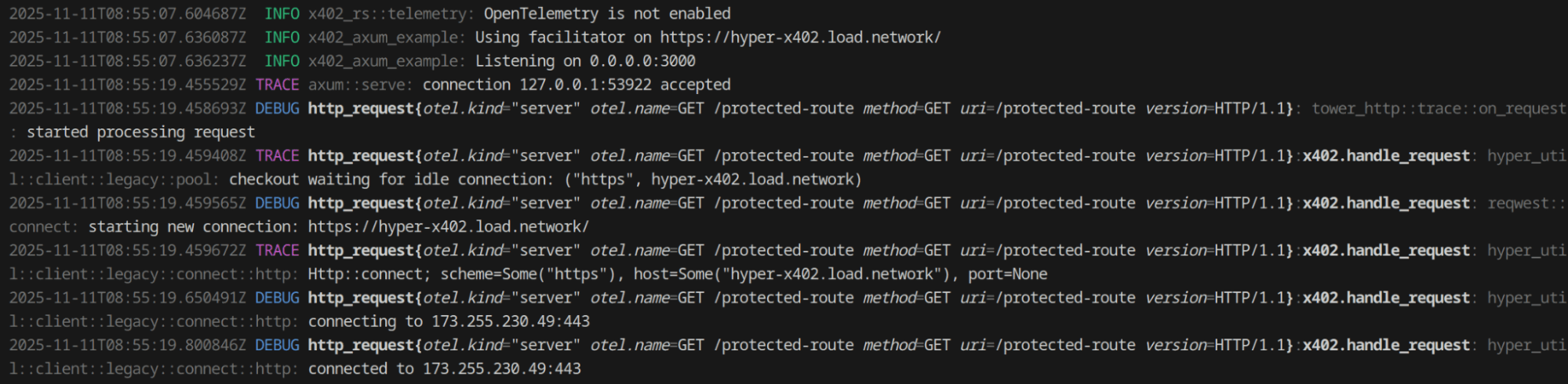 Alright, enough theory and implementation detail, let’s see how we can use this in practice. The hyper-x402 ao facilitator is hosted under hyper-x402.load.network (supports base & ao) and the best example to showcase it, is via the axum example: