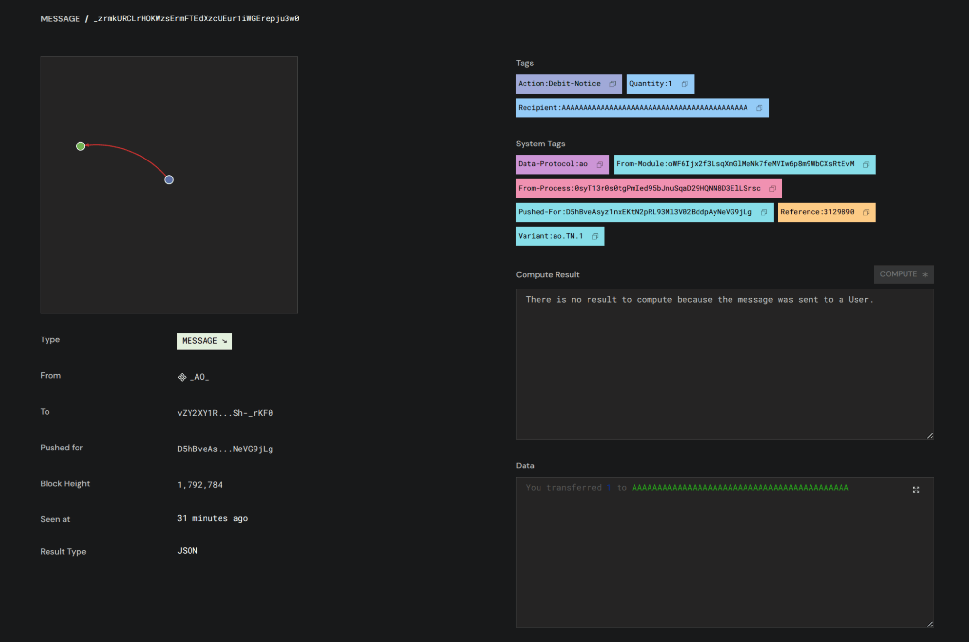 Now let’s pay and unlock this protected route! Run cargo run --bin ao_payment_helper and it will run the prebaked script that pays AO to the facilitator’s pay_to address (predefined as the A’s address) and it should return a response like this one: