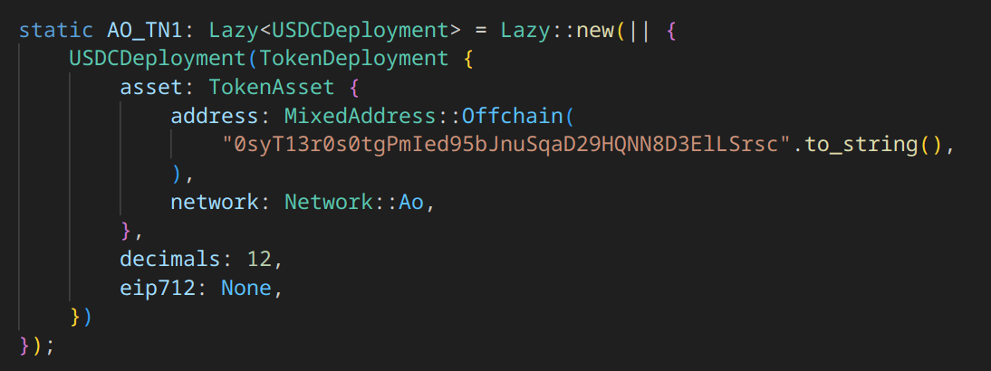 We will keep it light on the implementation details, but as a TL;DR, ao network definitions and some high level types have been added in network.rs and the ao token is defined there, under the USDCDeployment struct type for the each of types and helpers reuse by the user (dev):