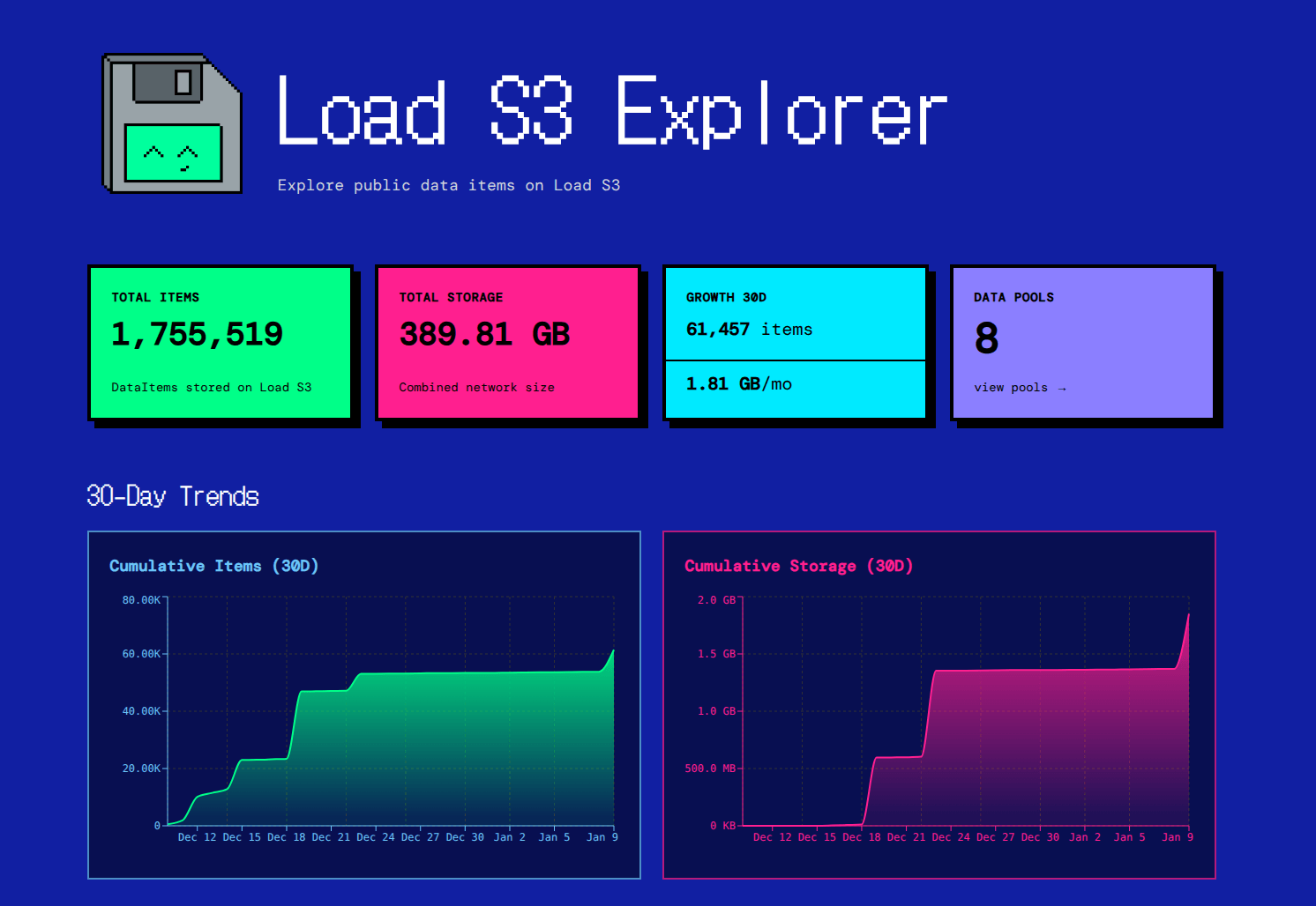 The explorer homepage shows the number of DataItems that flow from Load S3 to Arweave daily, and a feed of the most recent: