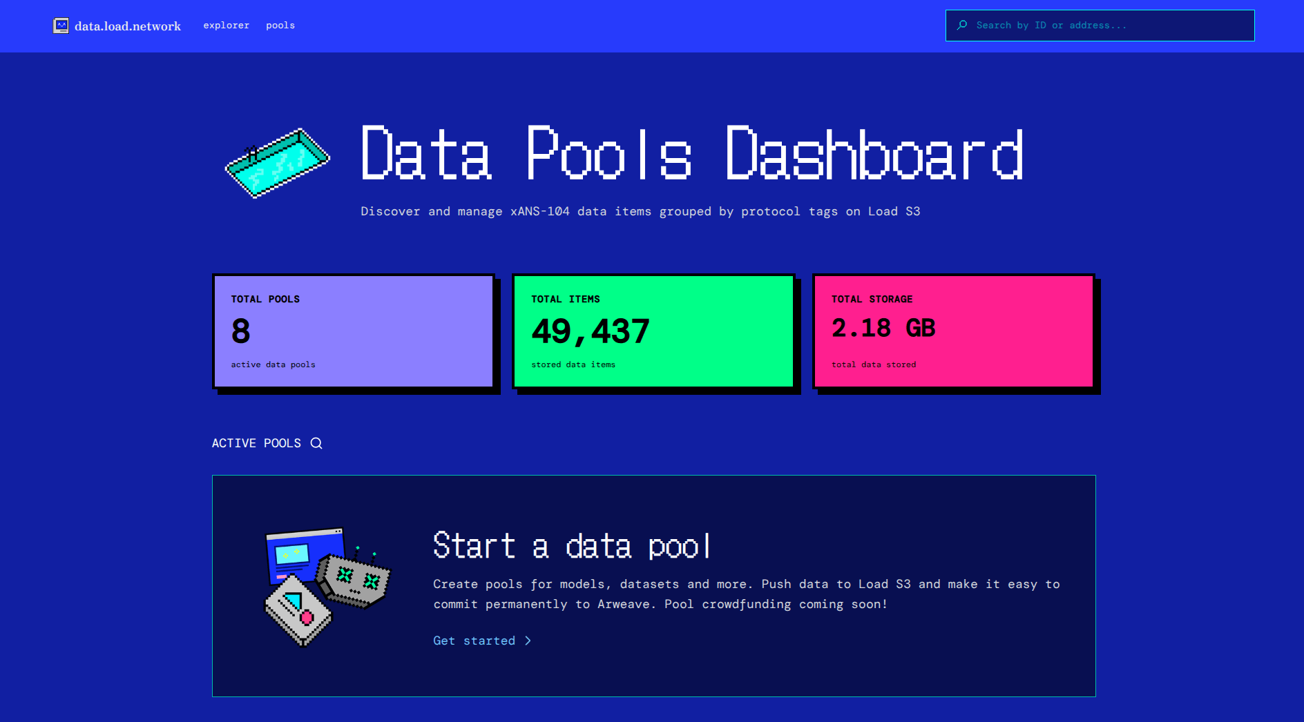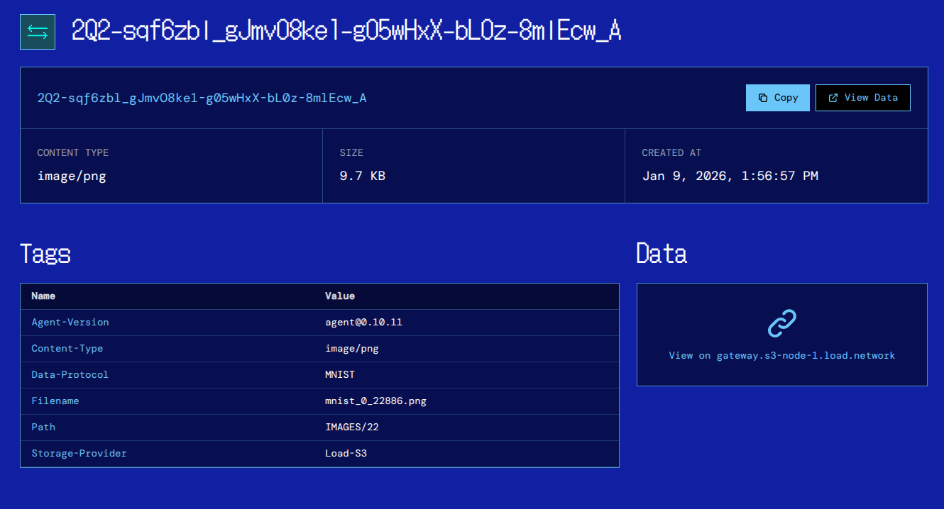 Uploading data this way makes it public on Load S3, anchorable on Arweave, and discoverable on the explorer.