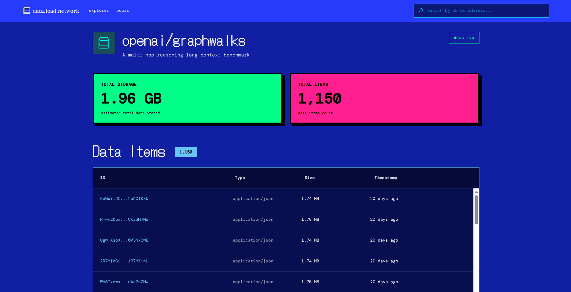 Set a unique tag system like Data-Protocol: openai/graphwalks, and the pools dashboard can index and display it as a dataset.