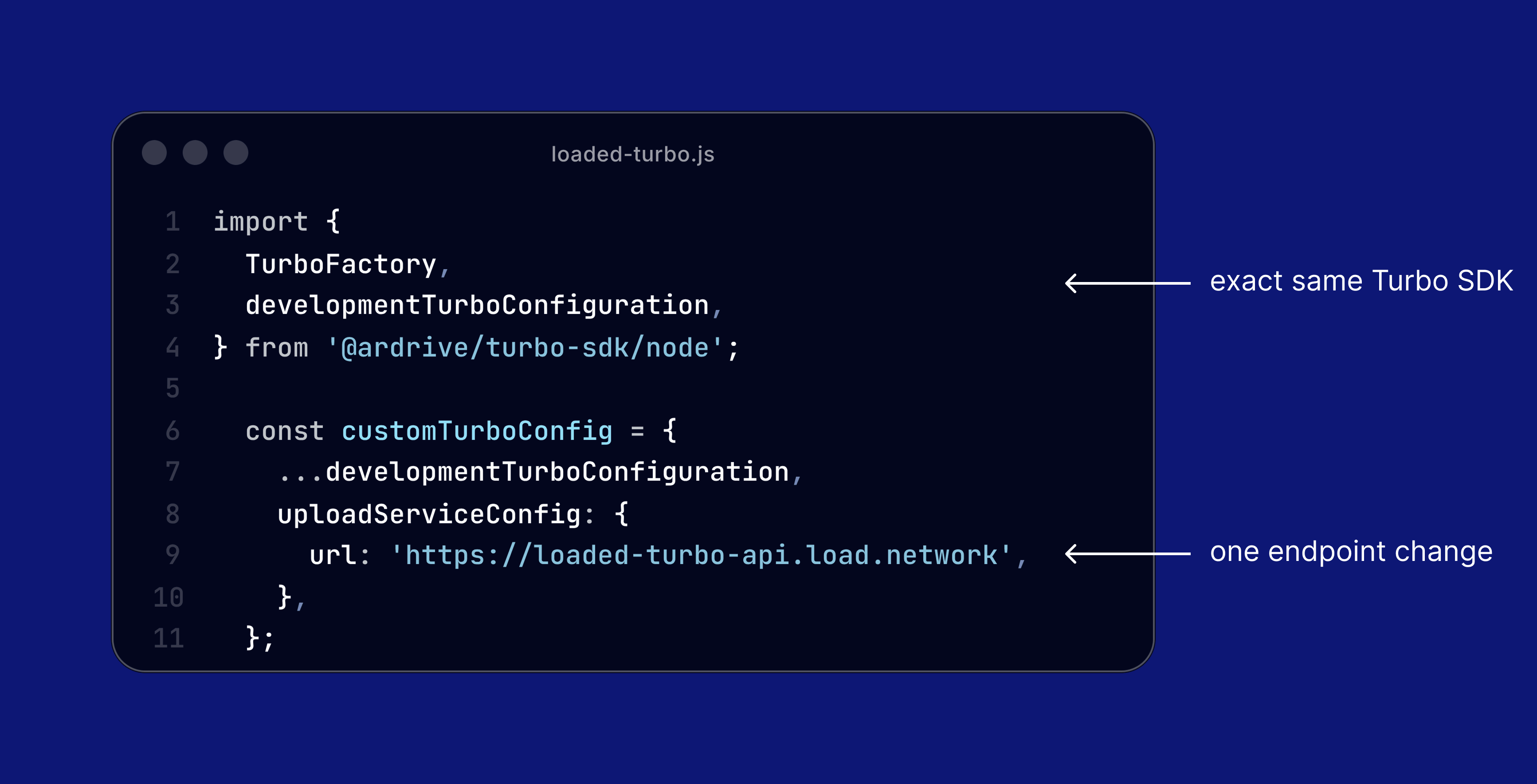 To use the Load’s upload service along Turbo SDK, just configure the TurboFactory with the new upload service endpoint. Here’s a JS example.
